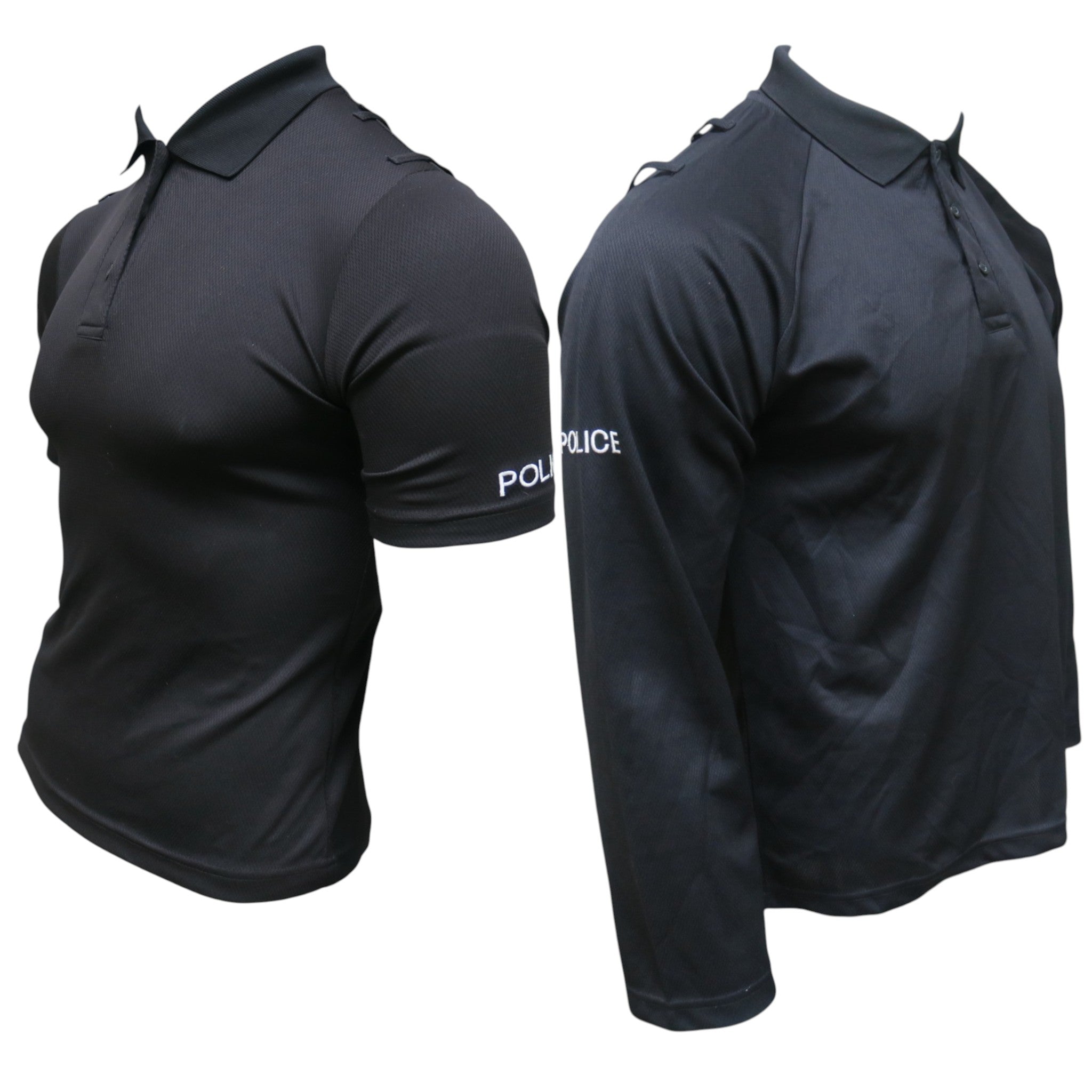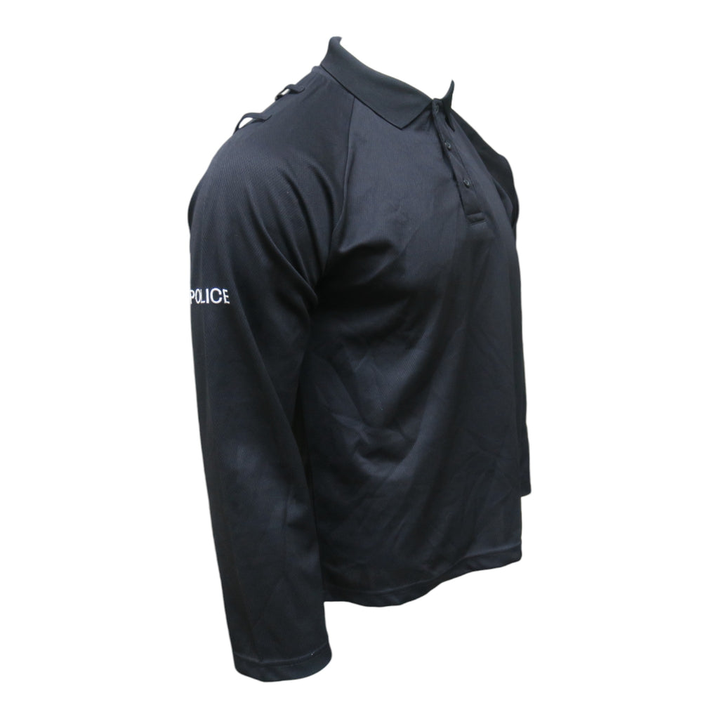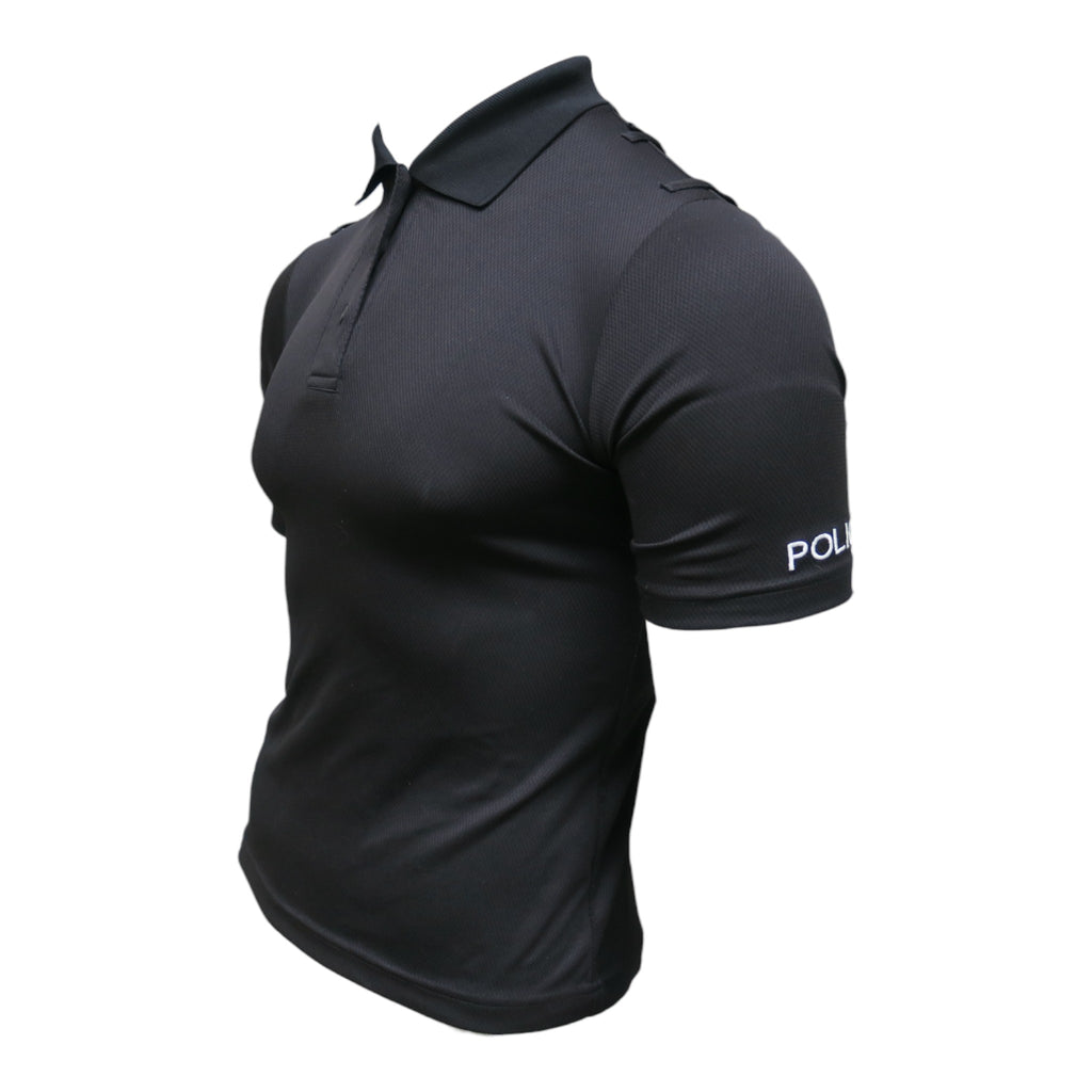 Grade 1BlackMoisture wicking materialEpaulette loops on shouldersQuarter-zipperEmbroidered POLICE on arm